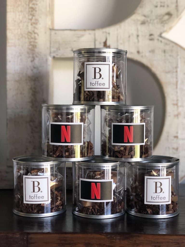 B. Toffee offers several options for elegant customized corporate gifts. Including your logo and a matching ribbon accent is a simple yet striking way to advertise. It’s a great way to say thank you while promoting your brand. Different box sizes are offered to suit your needs, whether that be individual gifs or larger options for groups. Custom canisters are also available should you decide you want to showcase your brand and your gift at the same time. You’ll have customers, employees, and clients hoping to work with you again just to take home another box of delectable award-winning toffee. It’s simply the best!