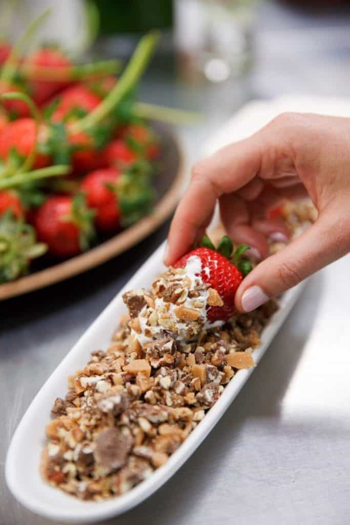 - Roll. Roll your coated strawberry into B. Bits to your liking.